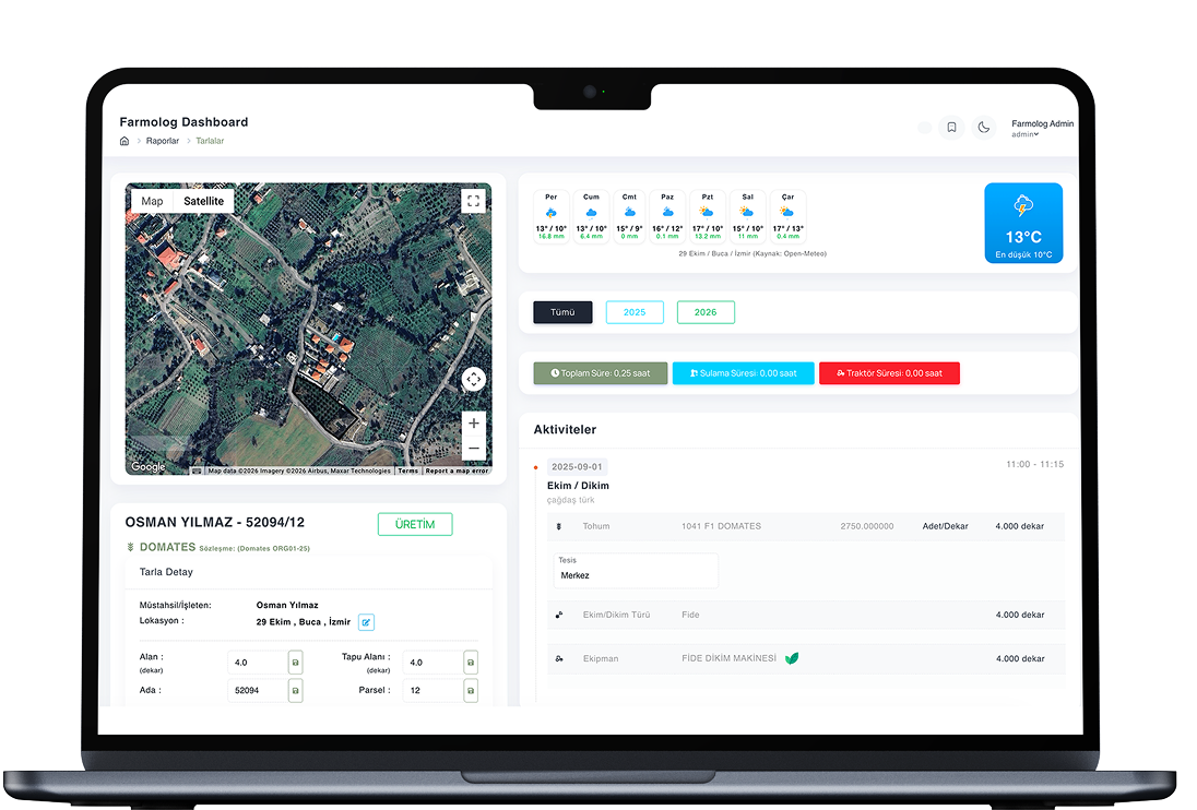 Farmolog, tarım ve gıda sektöründeki tüm paydaşların ihtiyaçlarına uyum sağlayan, veri güvenliğini merkezine alan entegre bir dijital platformdur. Her veri anlam kazanır, her kullanıcı daha verimli çalışır.